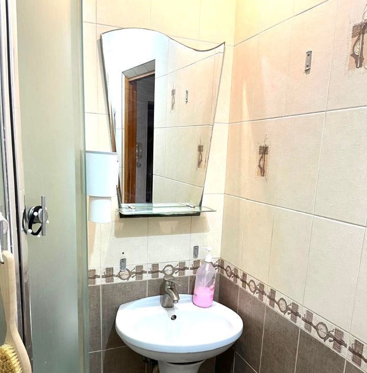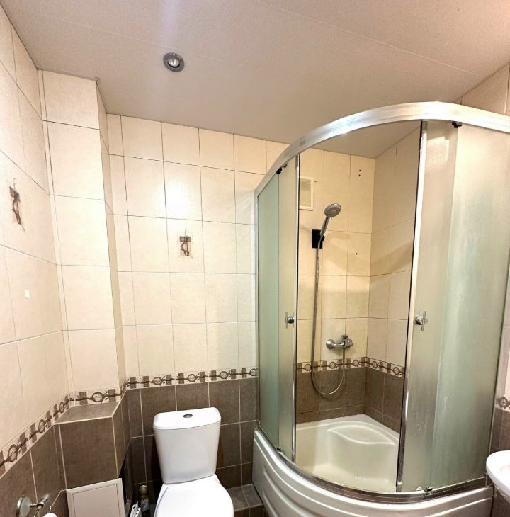 Есть вся необходимая мебель и техника для комфортной жизни, включая кровать и диван. Установлена удобная душевая кабина в санузле.