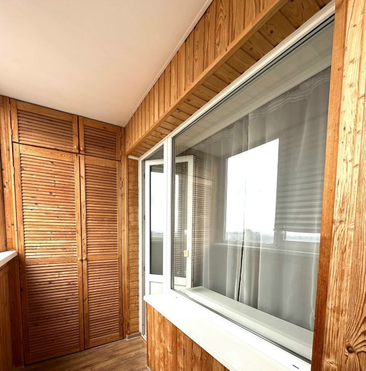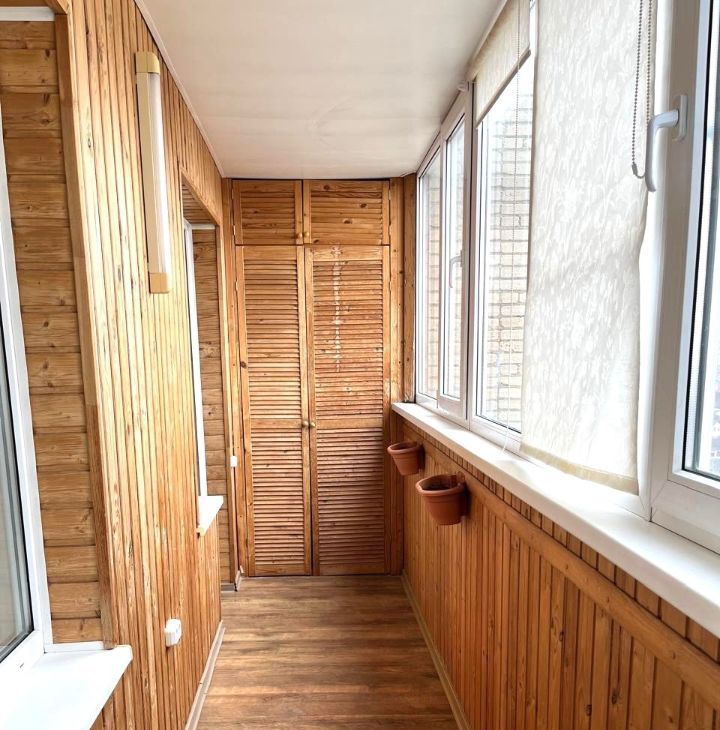 Просторный застеклённый балкон оборудован вместительными шкафами для хранения.