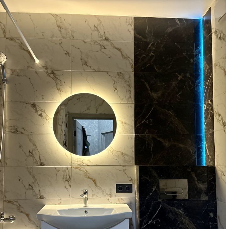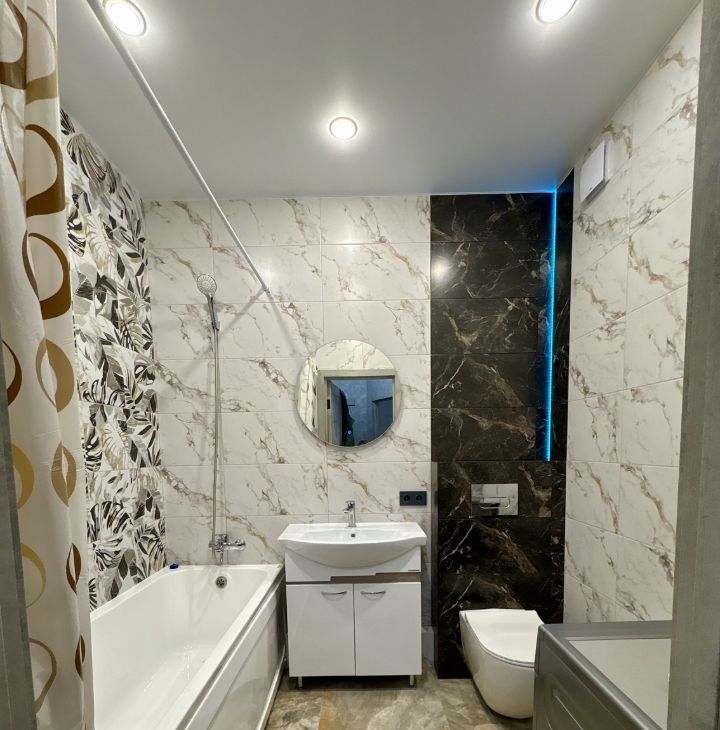 Санузел совмещённый, выполнен в стильном мраморном оформлении. В комнате установлен удобный большой диван.