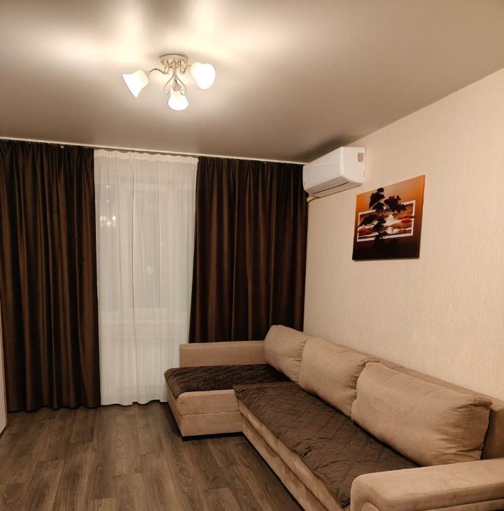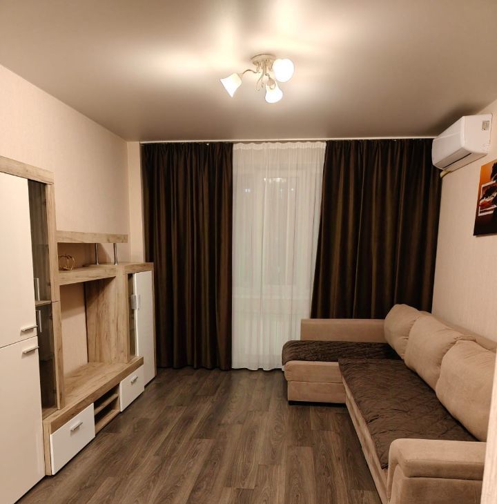 Квартира полностью готова к проживанию: современный евроремонт, мебель как на кухне, так и в комнате. Из техники есть всё необходимое для комфортного проживания: кондиционер, холодильник, телевизор и стиральная машина. Санузел совмещенный, оборудован ванной. Также есть выход на лоджию, где можно насладиться свежим воздухом.