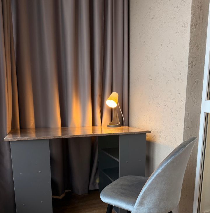 Балкон уютно обыгран в кабинет со столом и мягким стулом для работы или учебы, на лоджии висят тяжелые бархатные шторы!