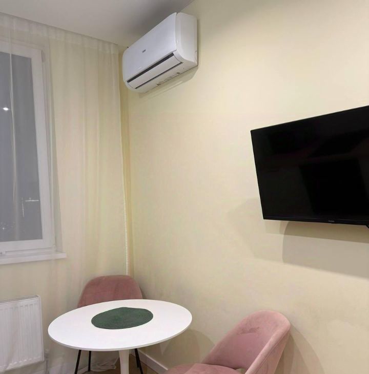 В квартире выполнен дизайнерский ремонт, предусмотрено все необходимое для комфортного проживания. Комната и кухня полностью меблированы, имеется кондиционер для поддержания комфортного микроклимата. Из техники также есть холодильник, телевизор и стиральная машина. Санузел совмещенный, оборудован ванной.