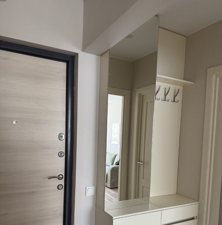 В квартире есть оборудованная гардеробная комната, в прихожей установлена мебель с зеркалом.