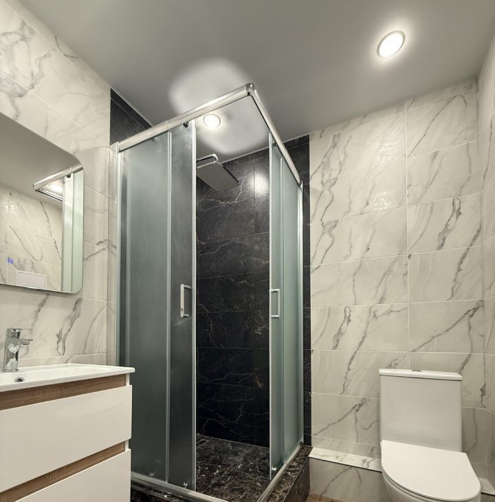 Ванная комната- душевая кабина с качественным ограждением, душевая стойка фирмы АМ РМ с тропическим душем и термостатом, тумба под раковину с раковиной, краном, зеркало (с подсветкой) также фирмы АМ РМ. Полотенцесушитель электрический- с возможностью регулирования температуры.