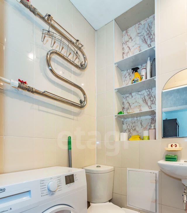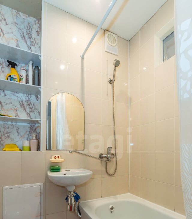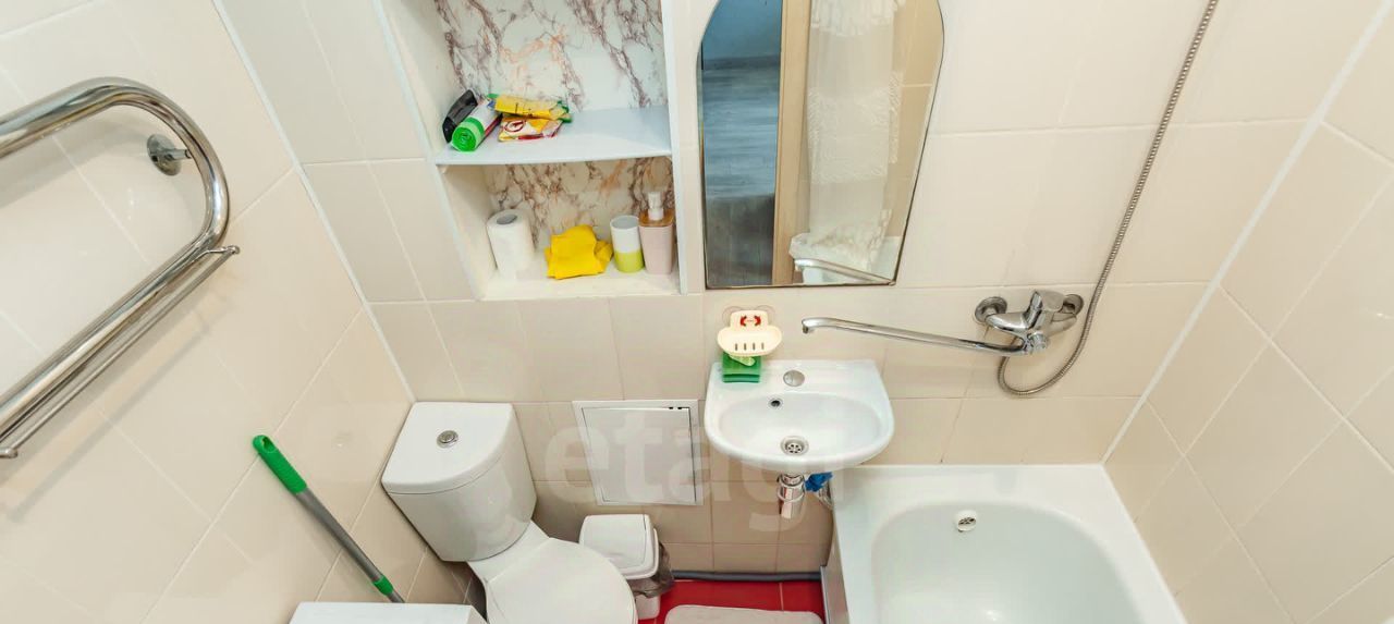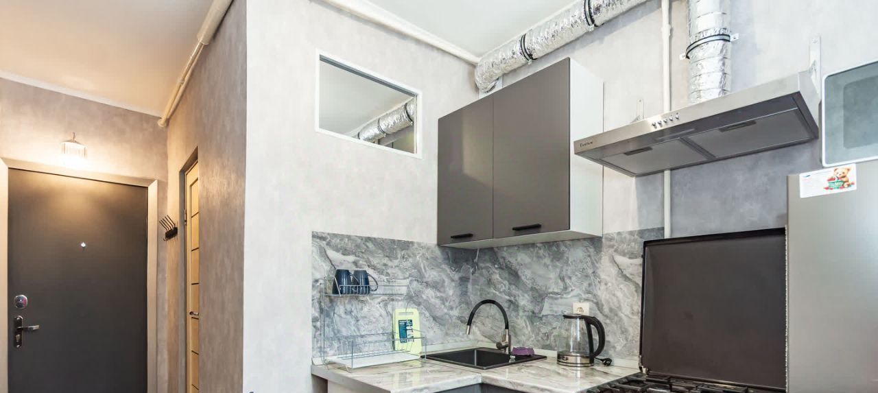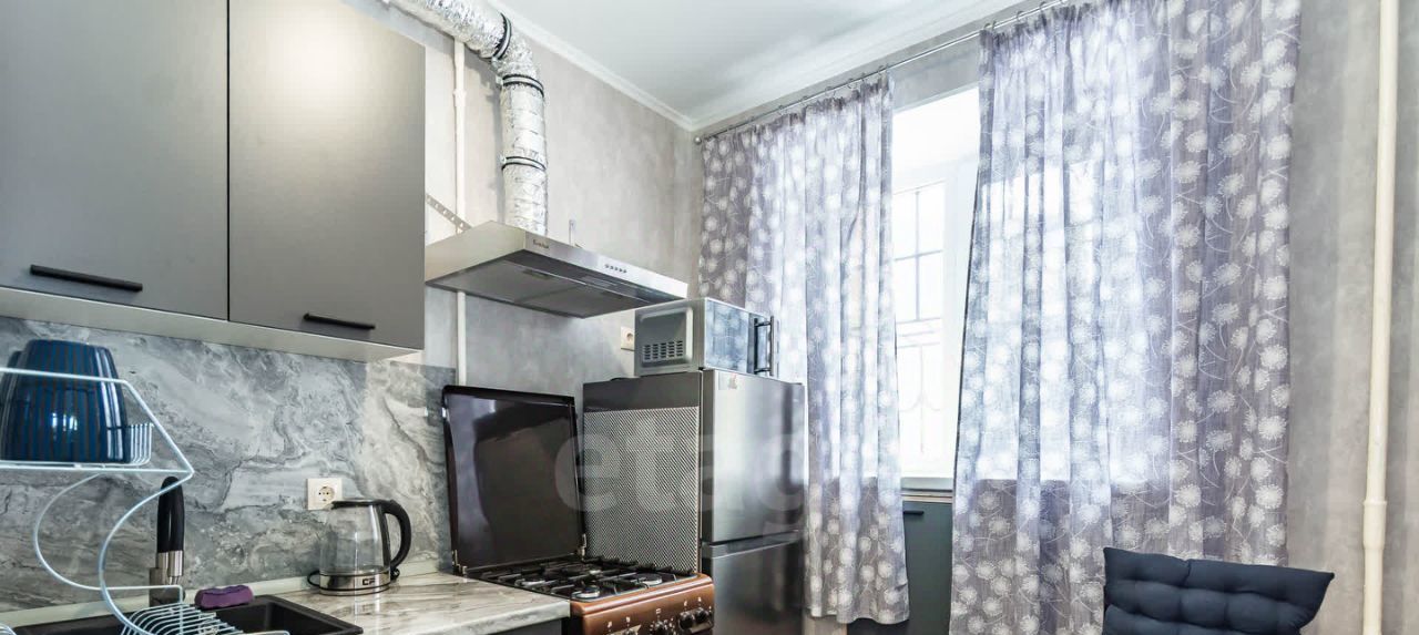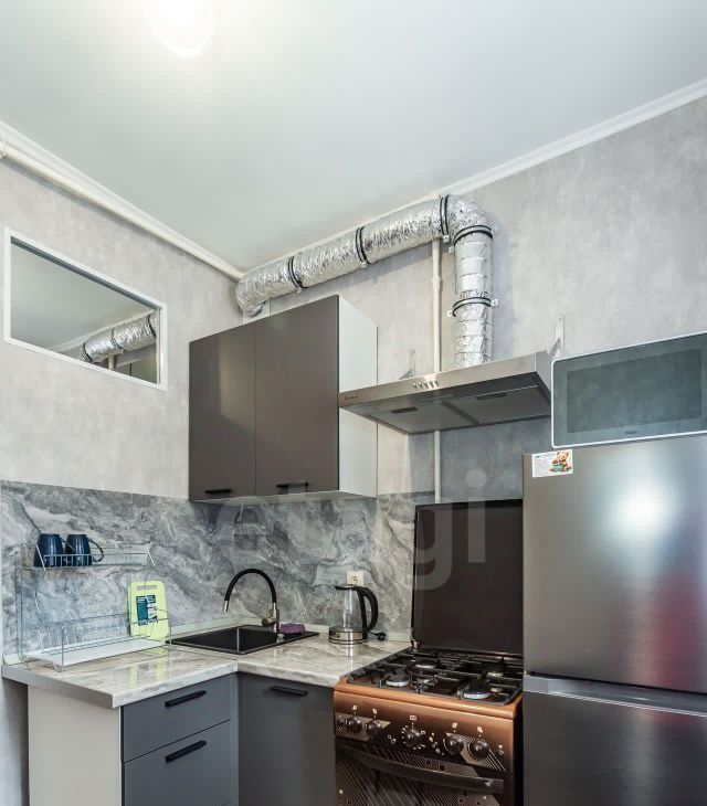 Кухня площадью 5 м² оборудована необходимой техникой: новый холодильник no frost, плита, микроволновая печь, вытяжка. Ванная комната совмещённая, с современной сантехникой, новой стиральной машиной и вытяжкой.