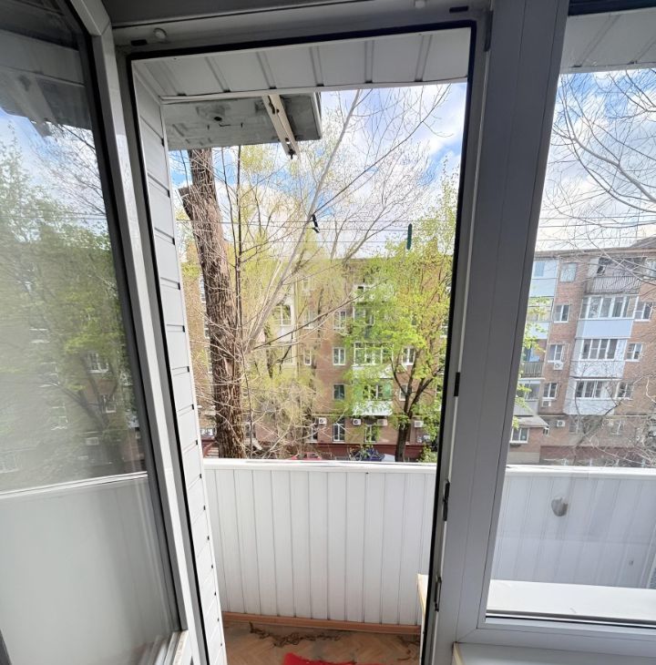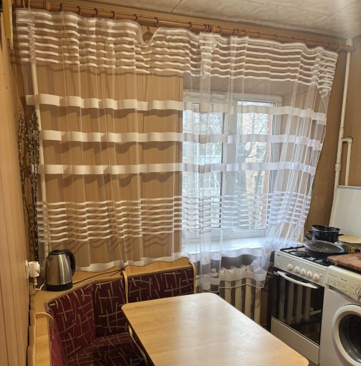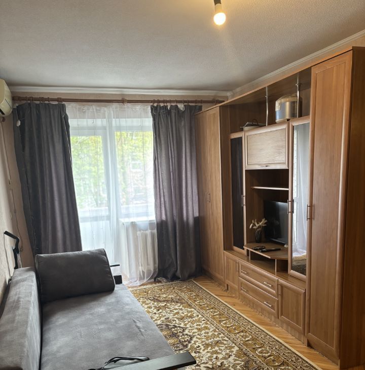 Кухня площадью 9 м² оснащена необходимой техникой, включая холодильник и стиральную машину. Просторная жилая комната оборудована шкафами и диваном, а также имеется телевизор. Из окон открывается вид на зелёный двор.