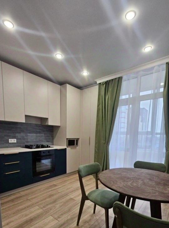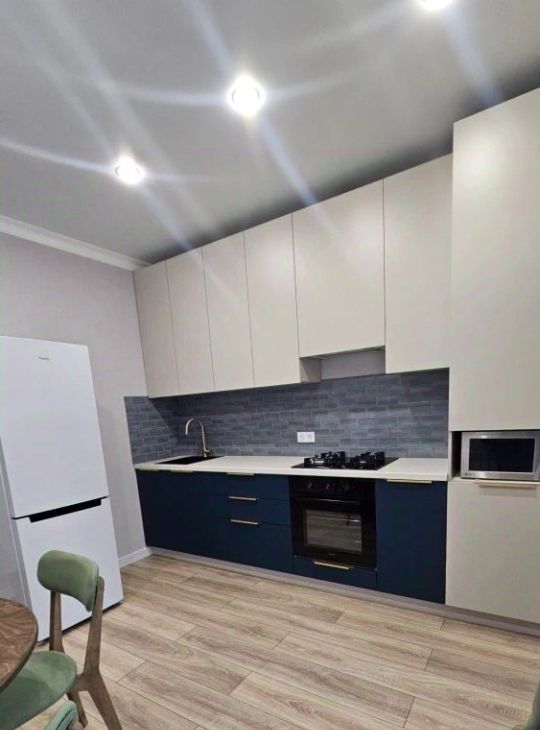 Полностью укомплектована всей необходимой мебелью и техникой (встроенная кухонная мебель, варочная панель с духовкой, микроволновая печь, холодильник, кухонный стол со стульями, шкафы для вещей, мягкий двуспальный диван, обувница).