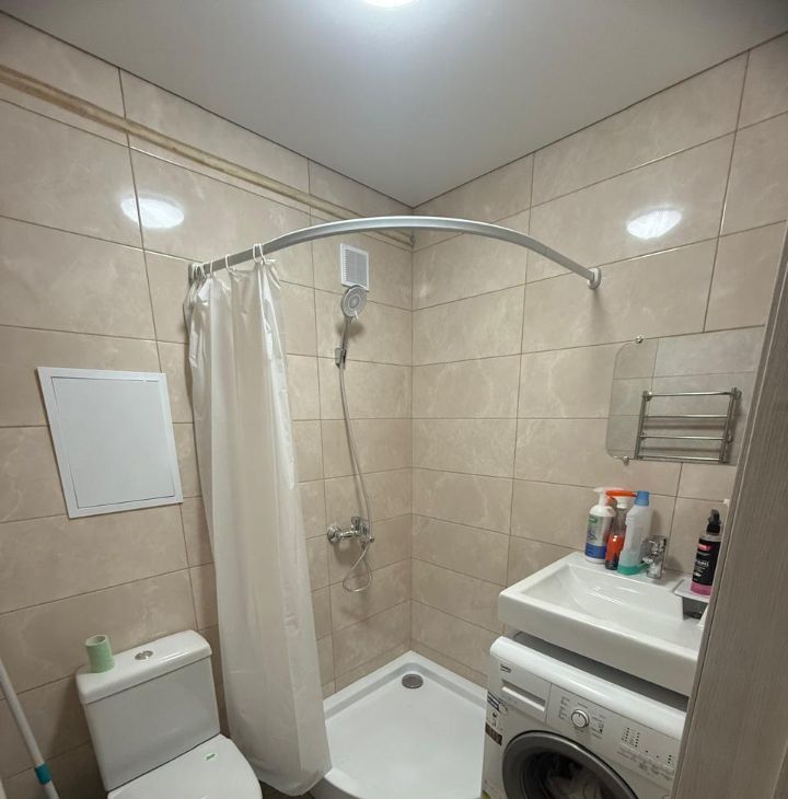 Квартира после ремонта, есть вся необходимая мебель. Из техники — кондиционер, холодильник и стиральная машина. Окна выходят на улицу, поэтому в квартире всегда светло.