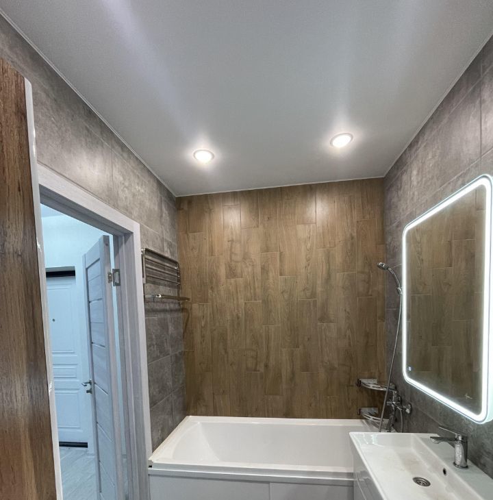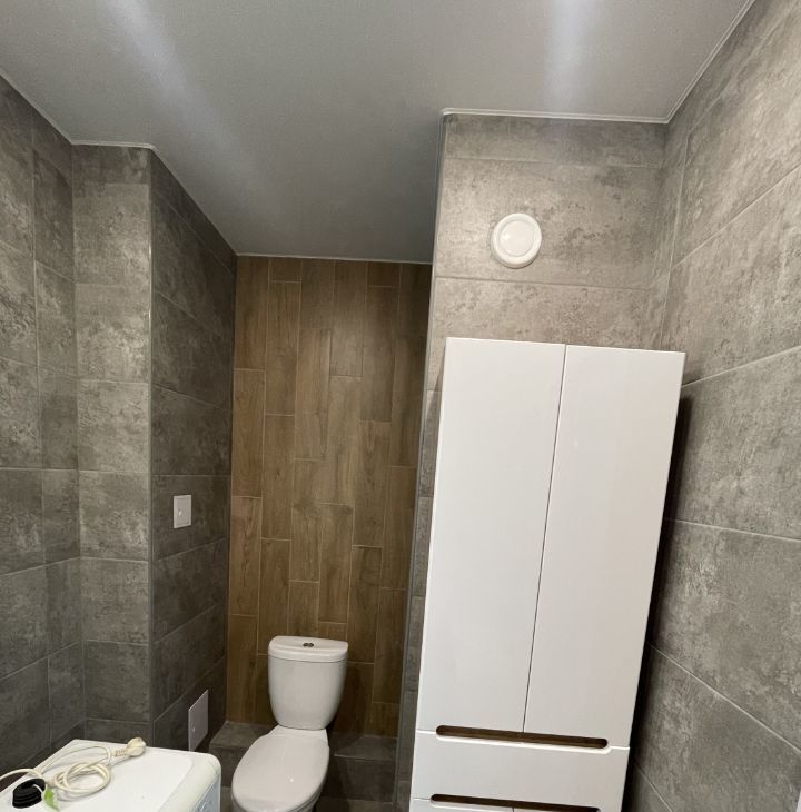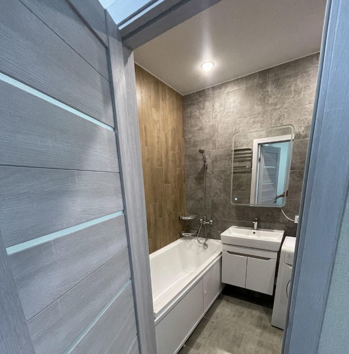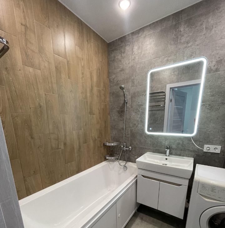 Ванная комната вся выложена плиткой, укомплектована стиральной машиной, Шкаф-пеналом, Зеркалом-шкаф с подсветкой, тумбой, умывальником, ванной, унитазом.