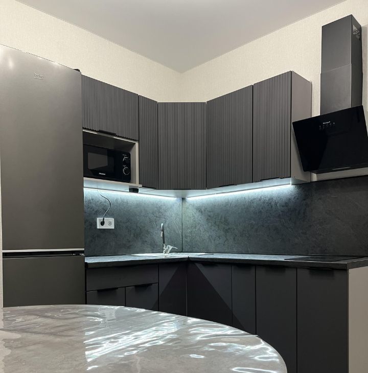Бытовая техника: холодильник, стиральная машина, варочная панель, вытяжка, микроволновая печь. Телевизор, кондиционер. Полотенцесушитель, вытяжка в санузле.