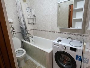 В ванной надежная гидроизоляция, дорогая дизайнерская плитка, стильное зеркало с подсветкой, места хранения, надежная стиральная машина Indesit.