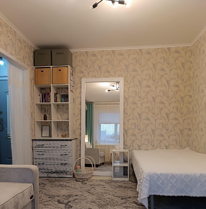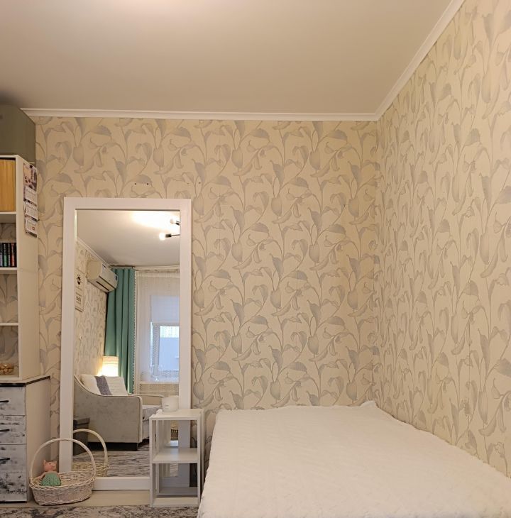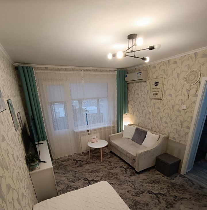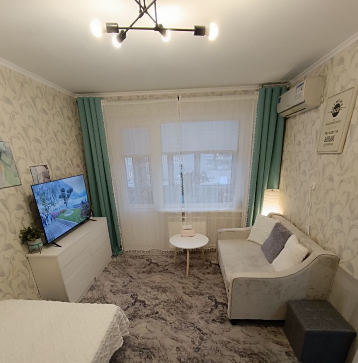 Квартира очень чистая и светлая. Сделано зонирование: полноценное спальное место с кроватью и уютная зона гостиной с диваном и ТВ. Огромное зеркало в пол визуально удваивает объем комнаты.
