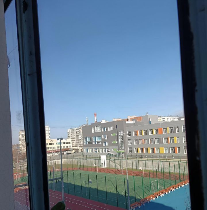 Вид из окна: Прямо под окнами — новая современная школа и спортивный стадион (безопасный путь для детей!).