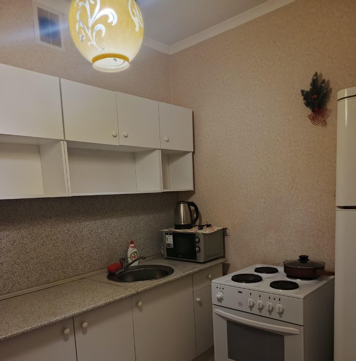 В квартире выполнен косметический ремонт, что позволяет сразу заехать и жить.Комната обставлена мебелью, а на кухне имеется вся необходимая техника: кондиционер, холодильник, телевизор и стиральная машина. Санузел совмещенный и оборудован ванной. Из кухни есть выход на балкон.