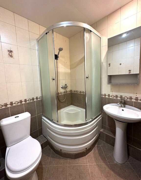 Есть вся необходимая мебель и техника для комфортной жизни, включая кровать и диван. Установлена удобная душевая кабина в санузле.