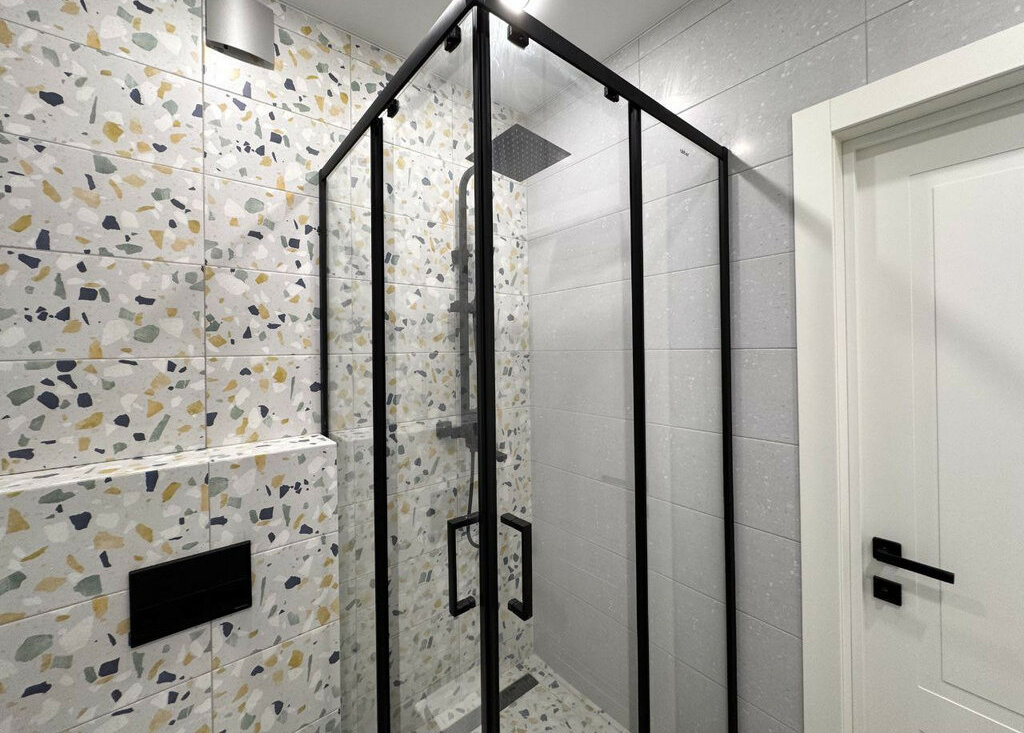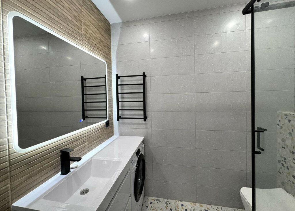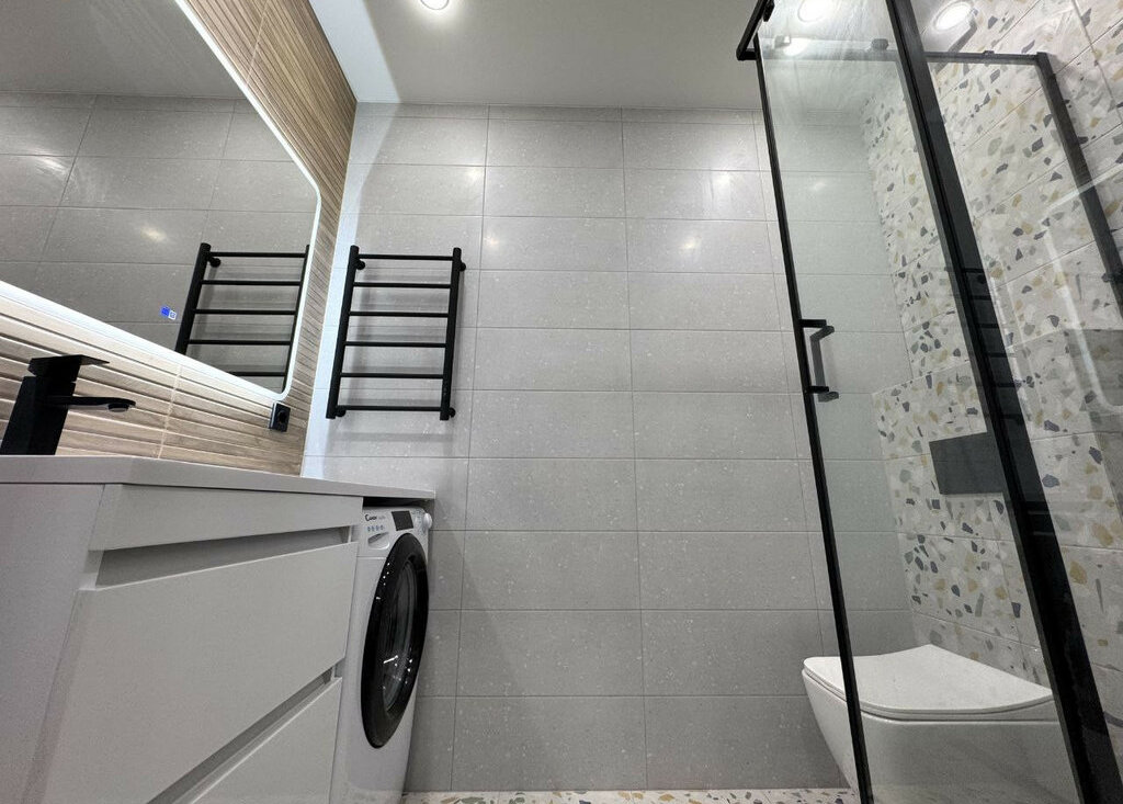 Санузел совмещенный со стиральной машиной и душевой кабиной.
