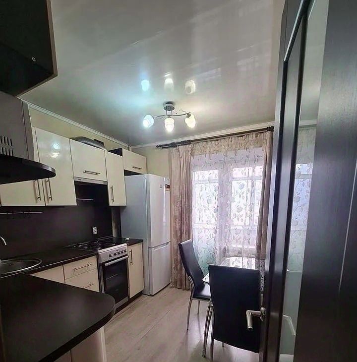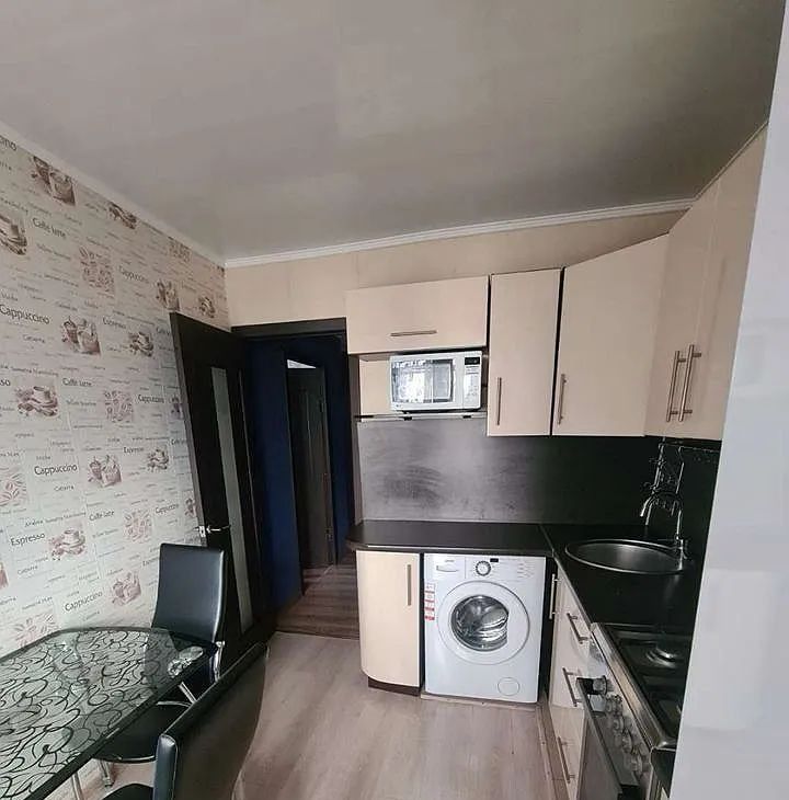 Кухня порадует вас современным угловым гарнитуром, который не только функционален, но и стильно выглядит. В вашем распоряжении двухкамерный холодильник для хранения продуктов, удобная обеденная зона, а также современная бытовая техника: стиральная машина и микроволновая печь.