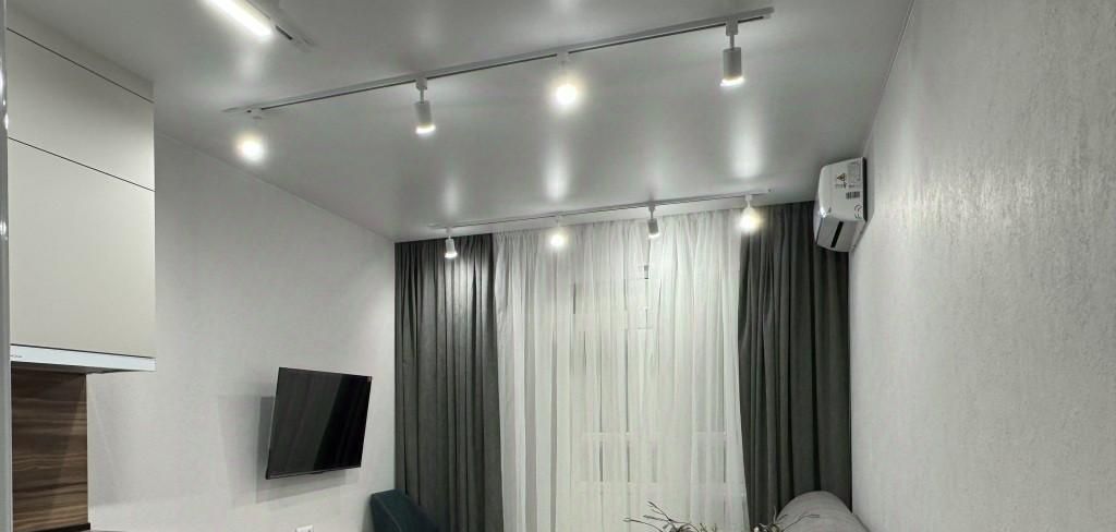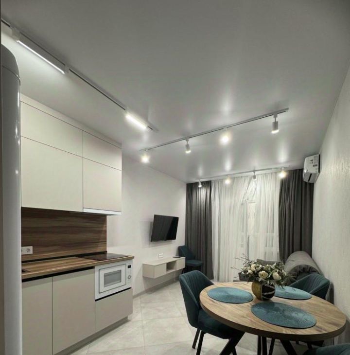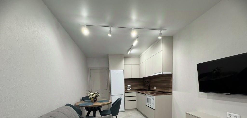 Планировка: кухня совмещена с гостиной зоной+ изолированная спальня, гардеробная, с/у, застекленная лоджия.