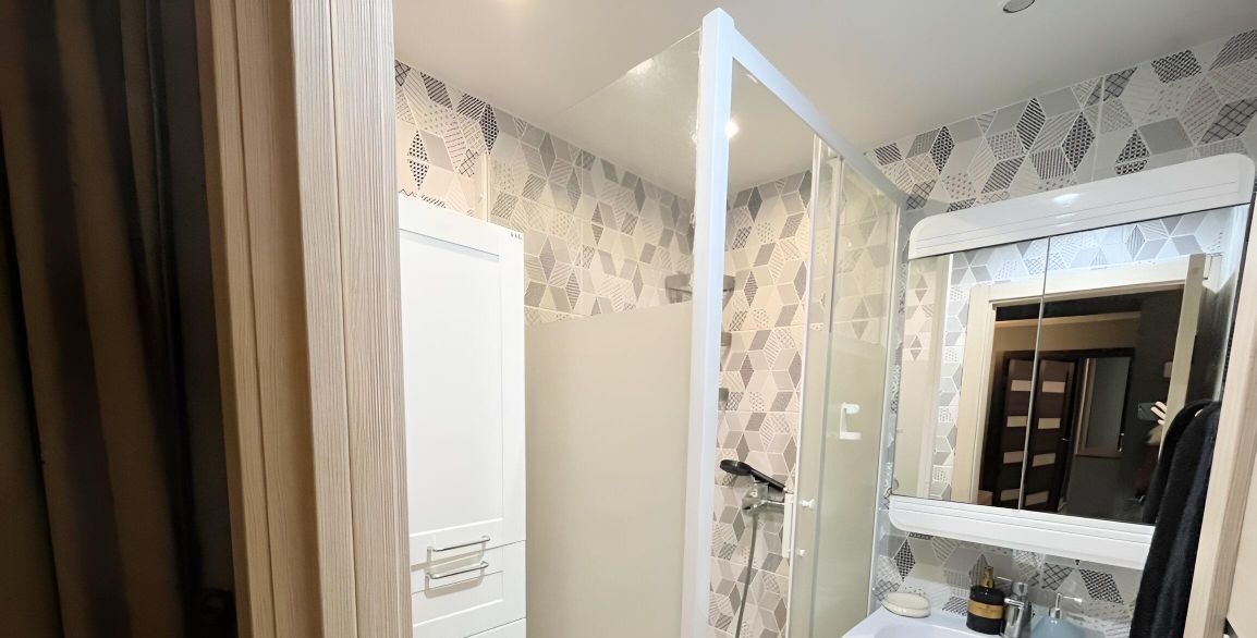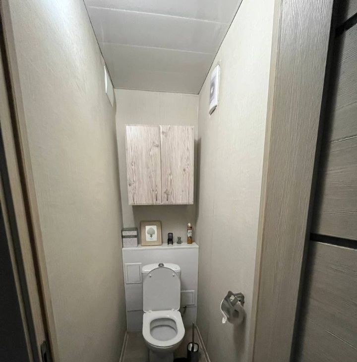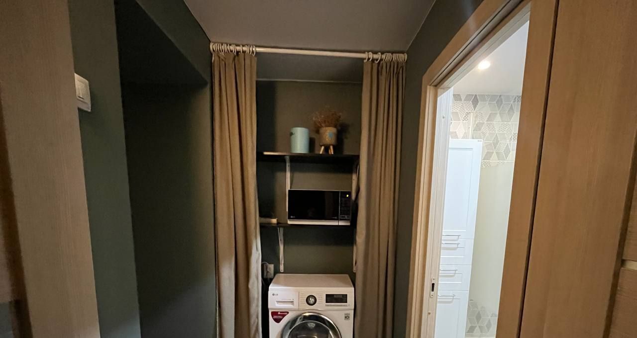 Раздельный санузел, в ванной душевая кабина, в нише рядом с ванной - стиральная машина.