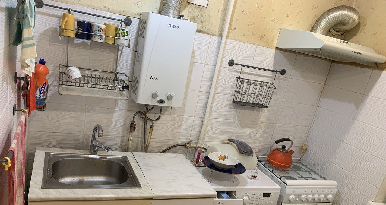 Кухня оборудована всем необходимым: газовая плита, холодильник и стиральная машина. Ванная комната совмещенная, оформлена в светлых тонах.