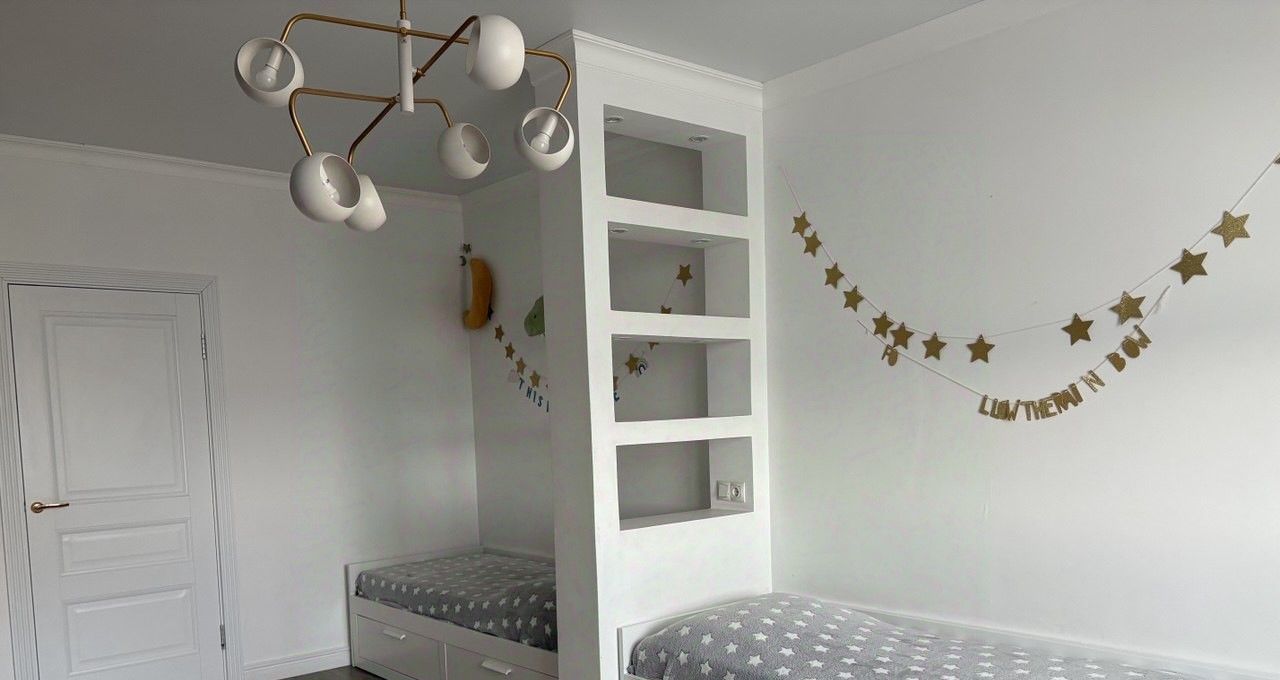 детская комната на два спальных места с большим рабочим столом и системой хранения;