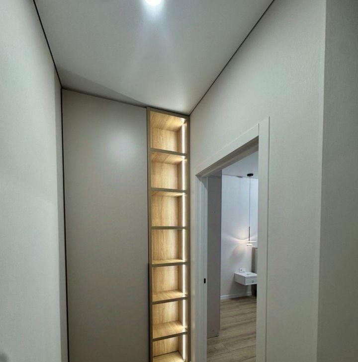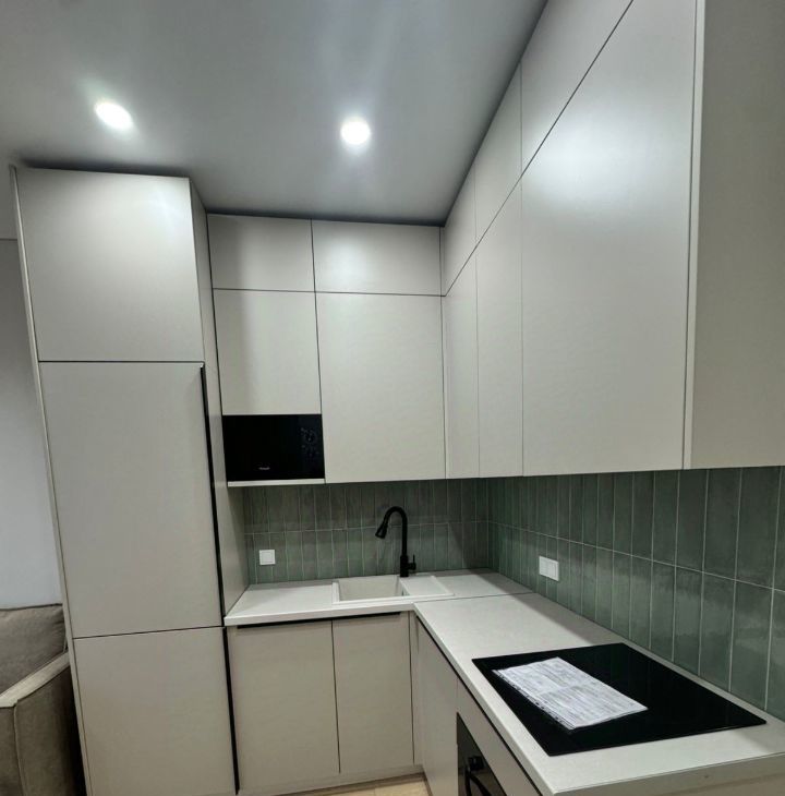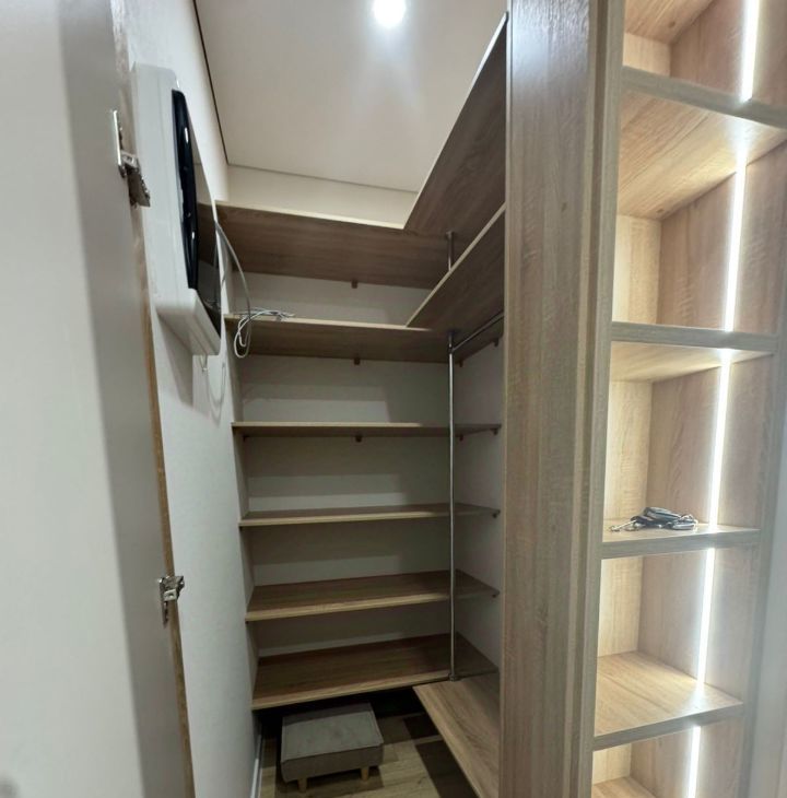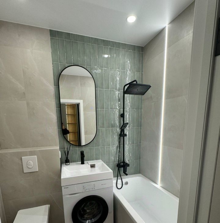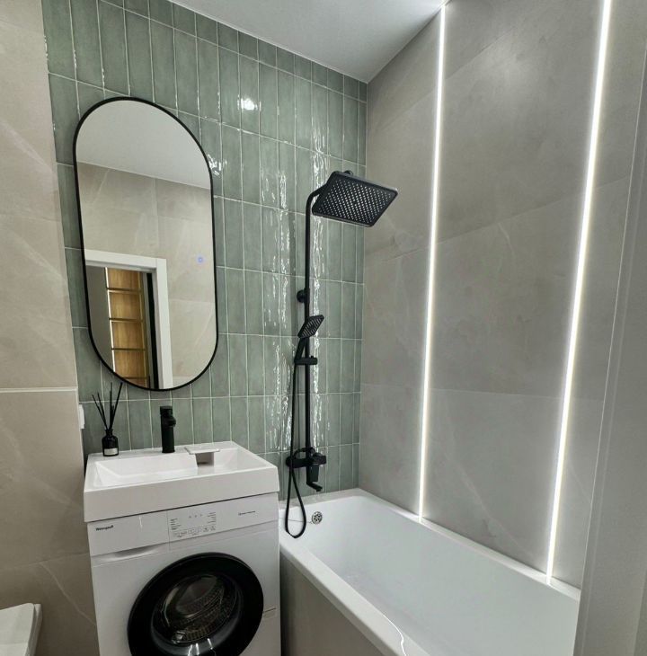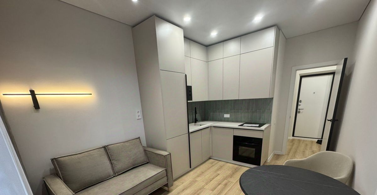 Просторная кухня-гостиная обставлена мебелью и оснащена всей необходимой техникой. Очень удобное зонирование светом. Ванная комната оборудована полноценной ванной. Много мест для хранения. Всё продумано до мелочей. На всё стоят счётчики