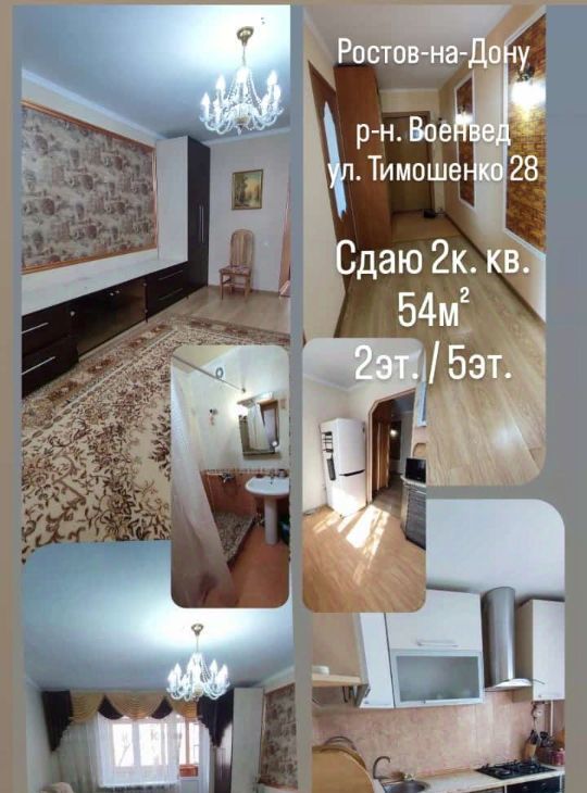 Сдаётся уютная двухкомнатная квартира в Ростове-на-Дону по адресу: улица Тимошенко, 28. Общая площадь — 54 кв. м, жилая — 40 кв. м, кухня — 8 кв. м. Квартира расположена на 2-м этаже 5-этажного кирпичного дома 1978 года постройки с высотой потолков 3,2 метра. Окна выходят в тихий двор, обеспечивая тишину и уют.