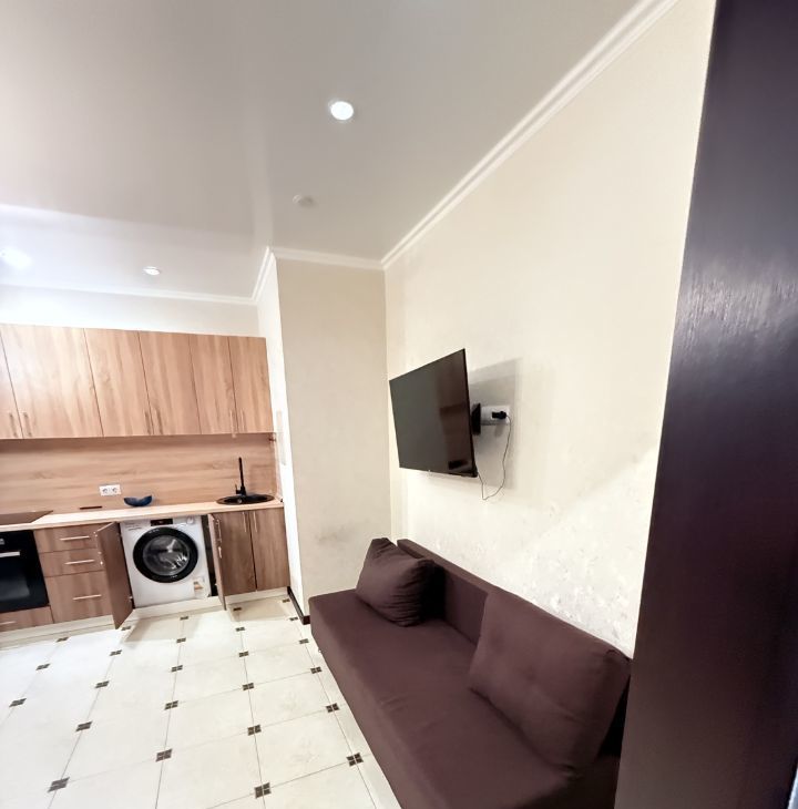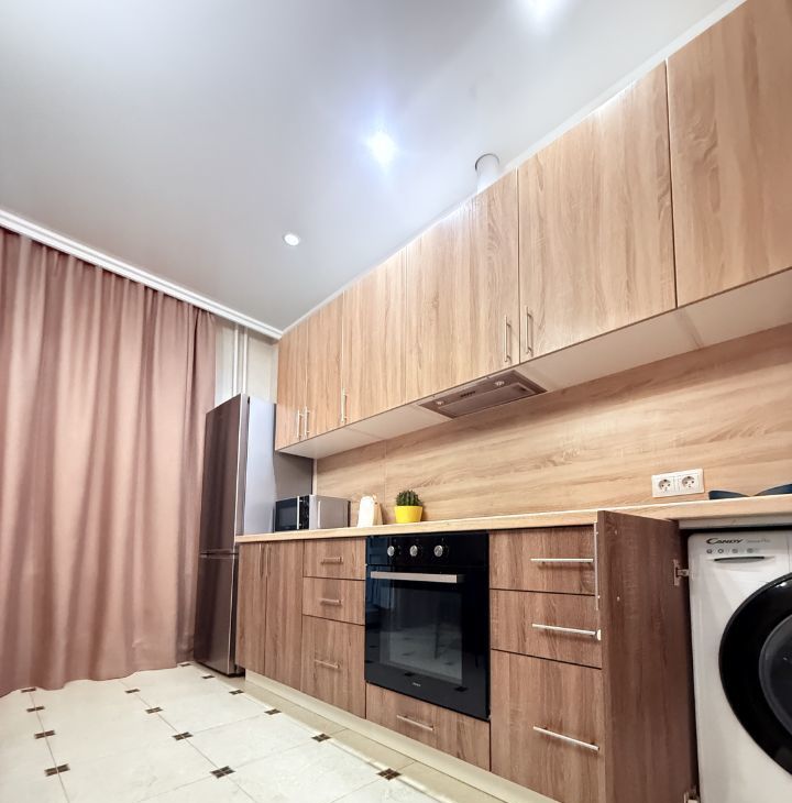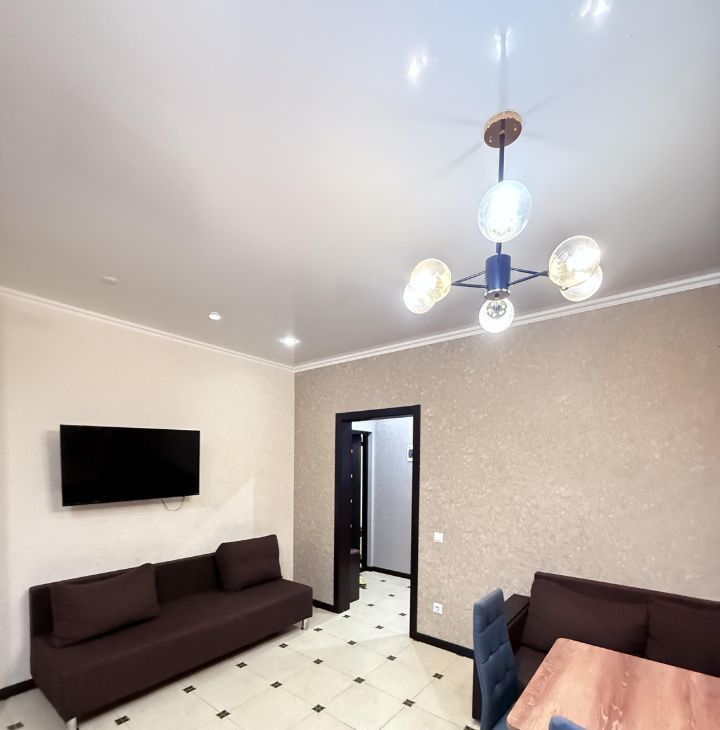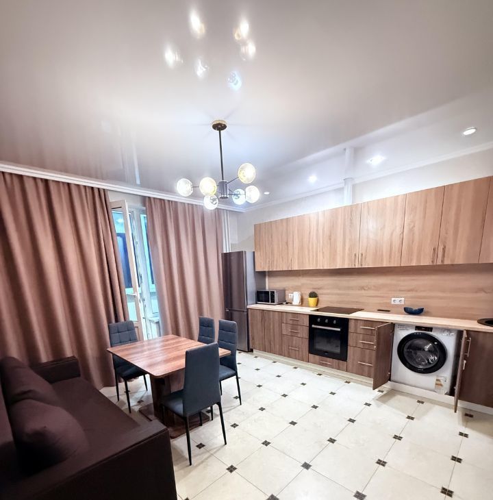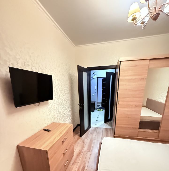В квартире есть всё необходимое для комфортного проживания. Стильный евроремонт и удобная планировка создают атмосферу уюта. Просторные комнаты обставлены мебелью, кухня полностью оборудована. В наличии вся необходимая техника: кондиционер, холодильник, телевизор и стиральная машина. Ванная комната с ванной, санузел совмещённый. К услугам жильцов интернет для бесперебойной связи.