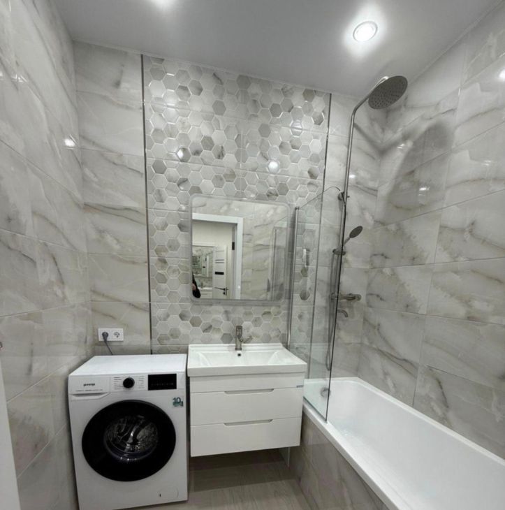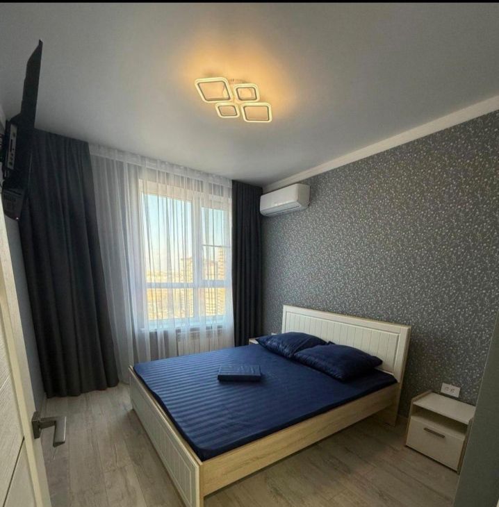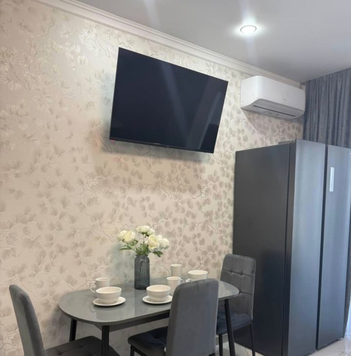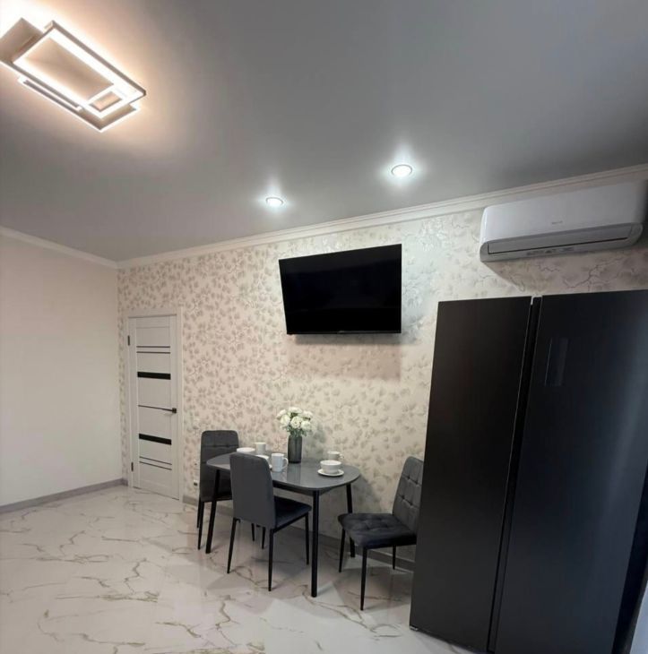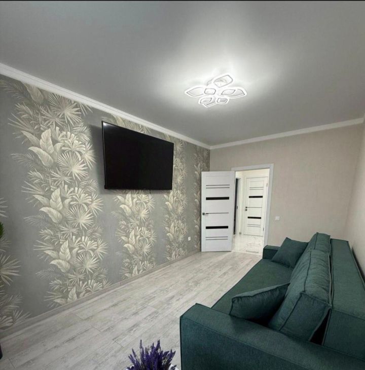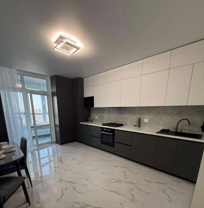 В квартире сделан качественный евроремонт. На кухне площадью 17.5 кв. м есть вся необходимая мебель и техника: большой холодильник, посудомоечная машина и стиральная машина, встроенная микроволновка, робот пылесос, телевизор. В спальне и гостиной также есть вся необходимая новая мебель. Во всей квартире тёплые полы.