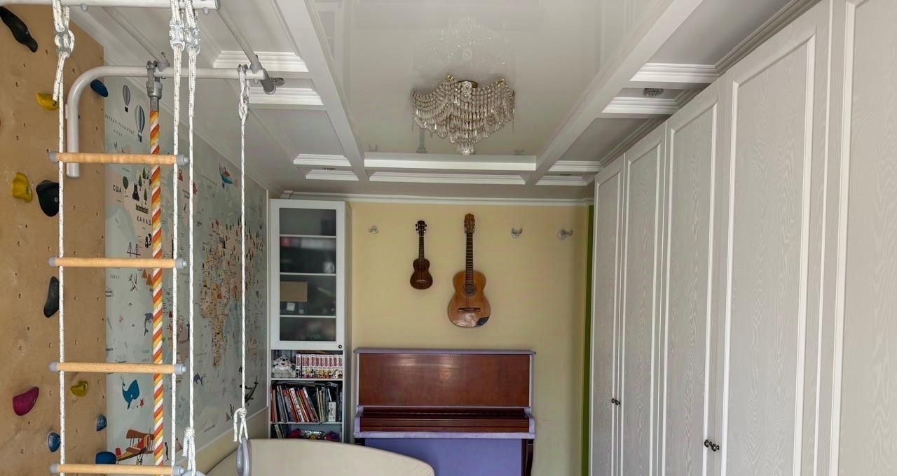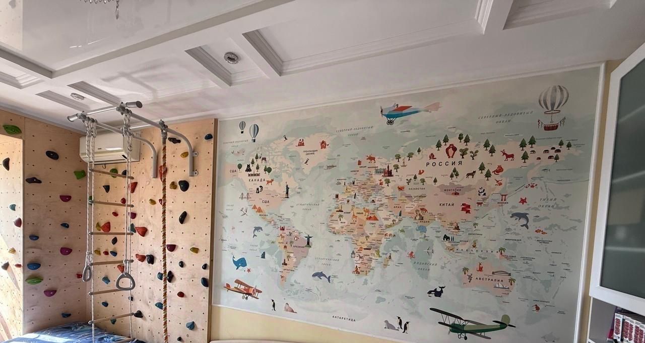 В детской комнате есть спортивный инвентарь, профессиональный скалодром с зацепами и матами, приточная вентиляция бризер Тион.