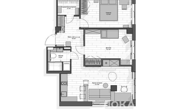 Количество комнат: 2 спальни + кухня-гостиная