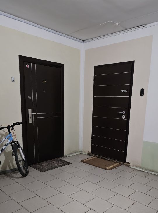 Большое пространство в подъезде на этаже - всего 5 квартир. Возможность для паркинга колясок, велосипедов. Можно организовать просторный тамбур на 3 квартиры.