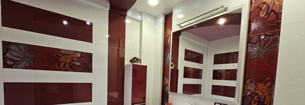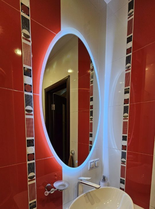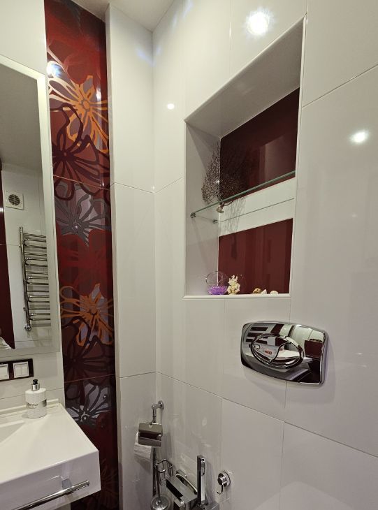 Ванная комната в приватной зоне - домашний СПА для релаксации после трудового дня. Оснащена роскошной джакузи со встроенной системой LED-подсветки, что позволяет создавать любую атмосферу, окрашивая воду в calming-тона. 3D вставка (аквариум) в плитке пола, встроенные зеркала и подсветка - создают настроение.