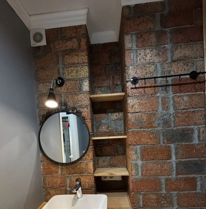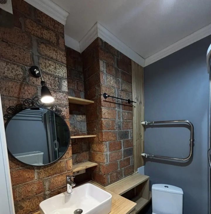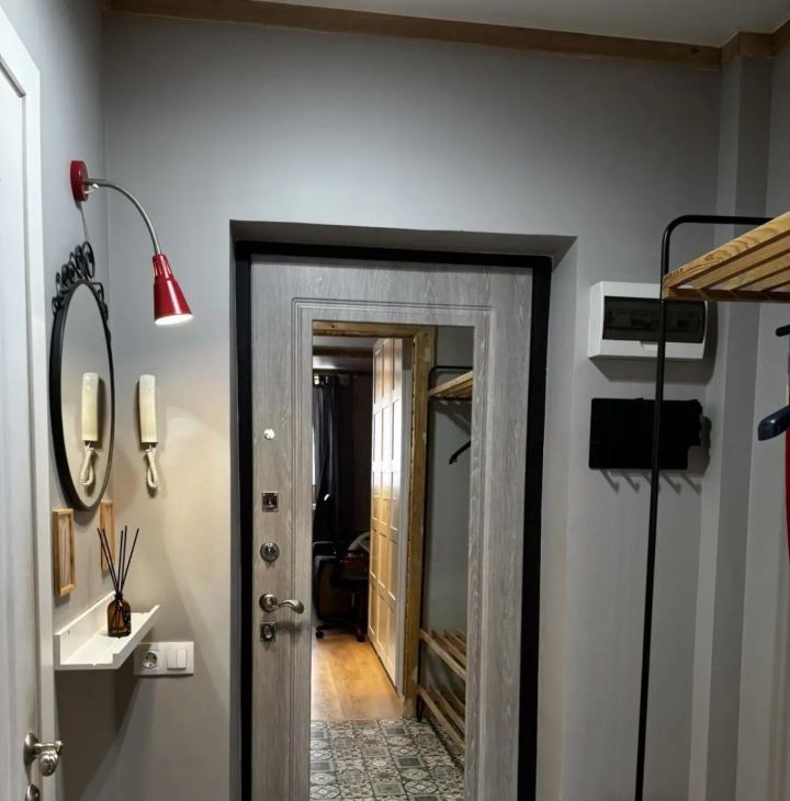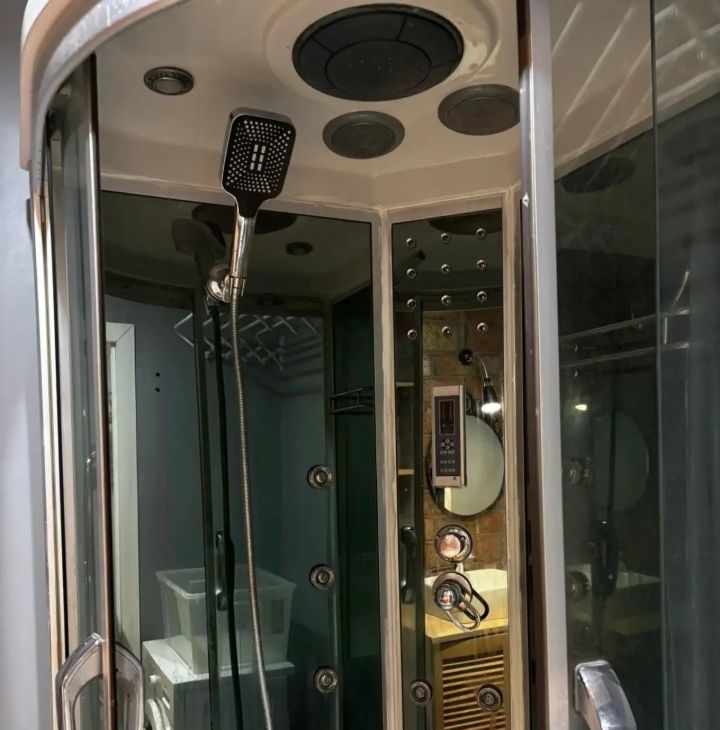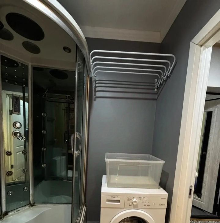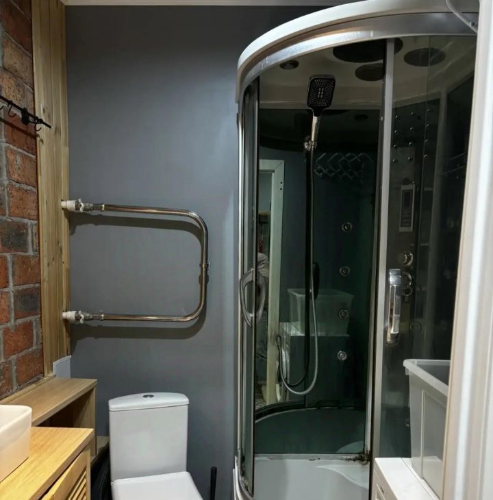 Санузел совмещённый, душевая кабина и стиральная машина. Также имеется умный домофон.