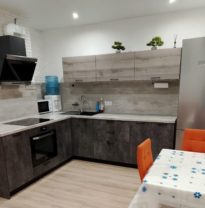 В квартире выполнен дизайнерский ремонт. Просторная кухня оснащена необходимой техникой: холодильник, плита, микроволновая печь и стиральная машина.