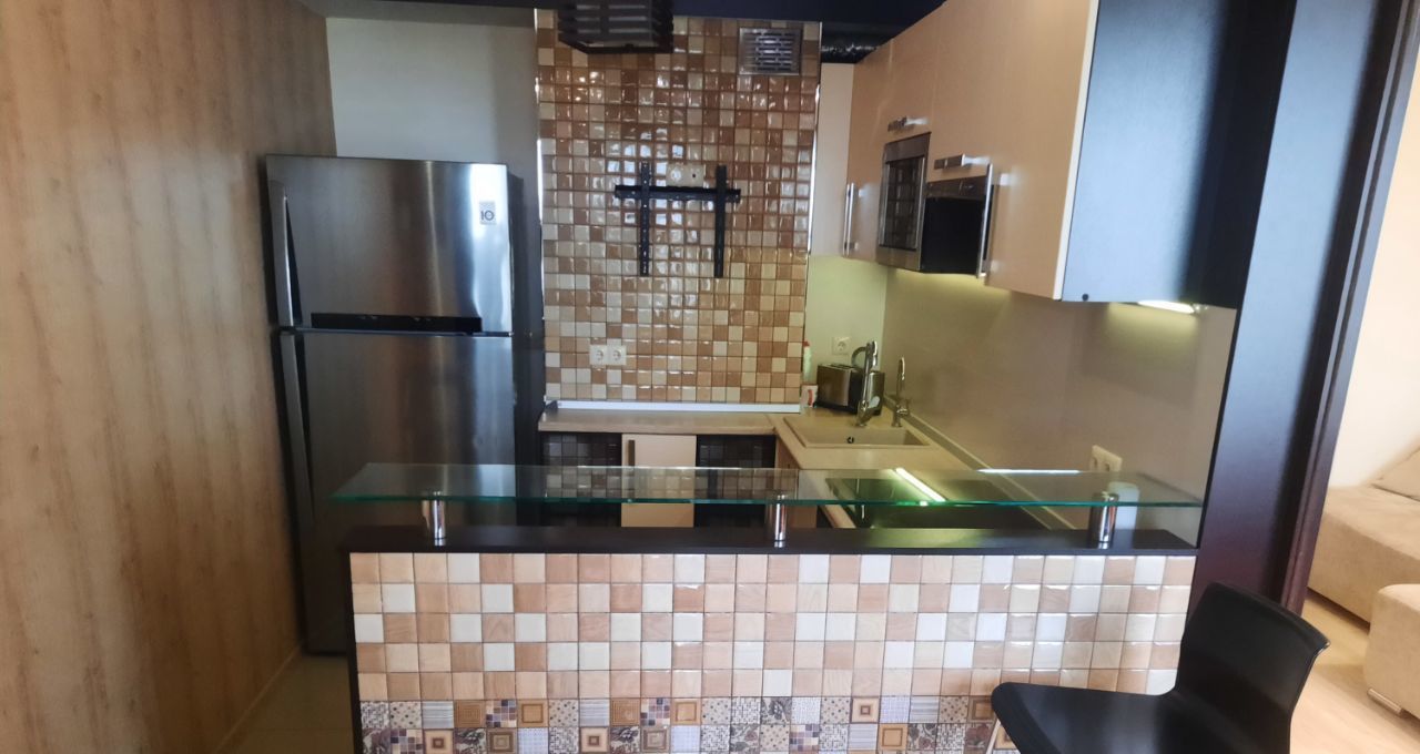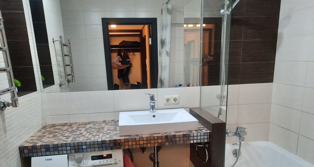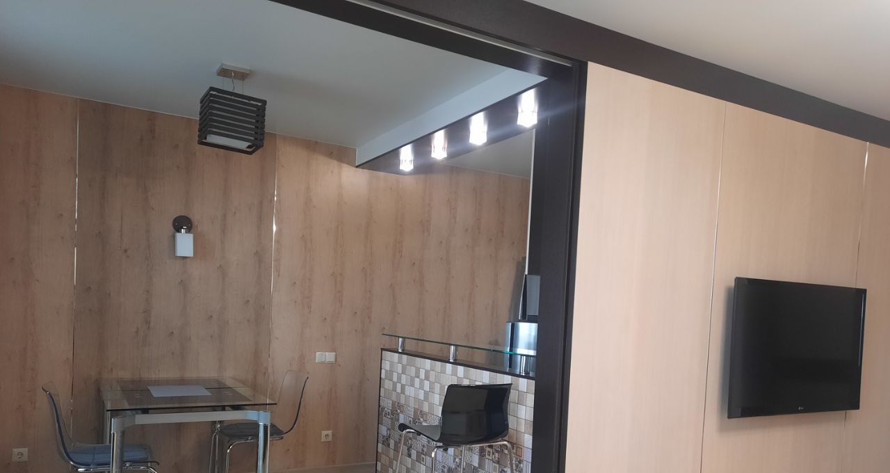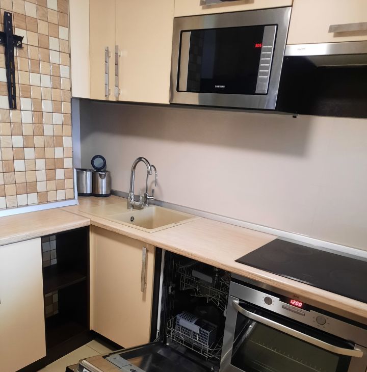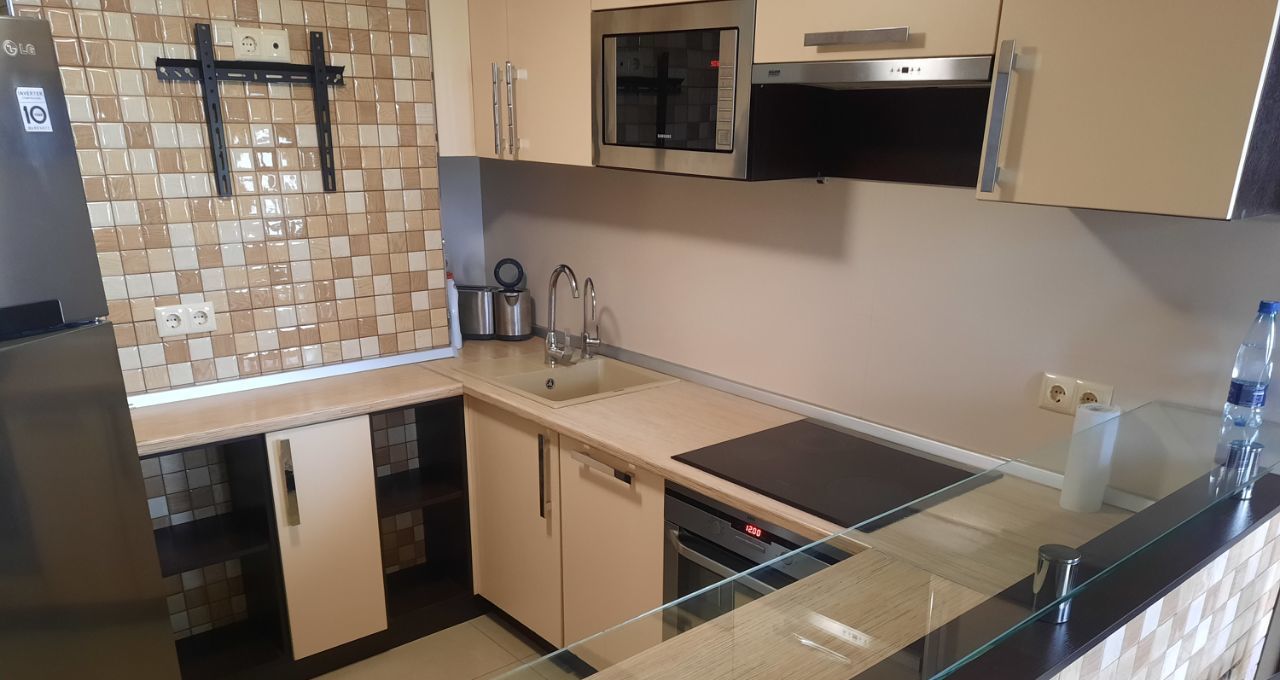 В квартире есть всё необходимое для комфортного проживания: современная мебель, кондиционер, холодильник, телевизор, посудомоечная и стиральная машины. Санузел совмещённый, с классической ванной.