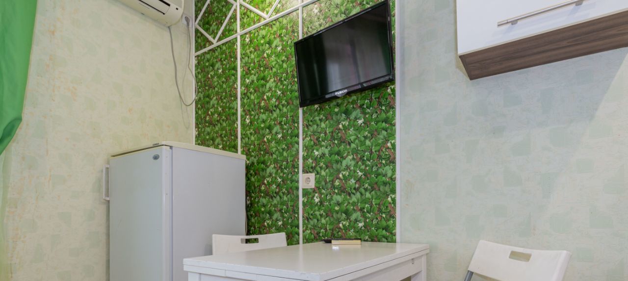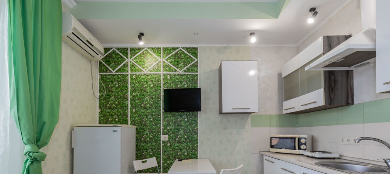 В квартире для проживания остается: новый двуспальный диван, микроволновка, кондиционер, стиральная машина, шкафы для хранения вещей, телевизор, остальное что видно на фото.