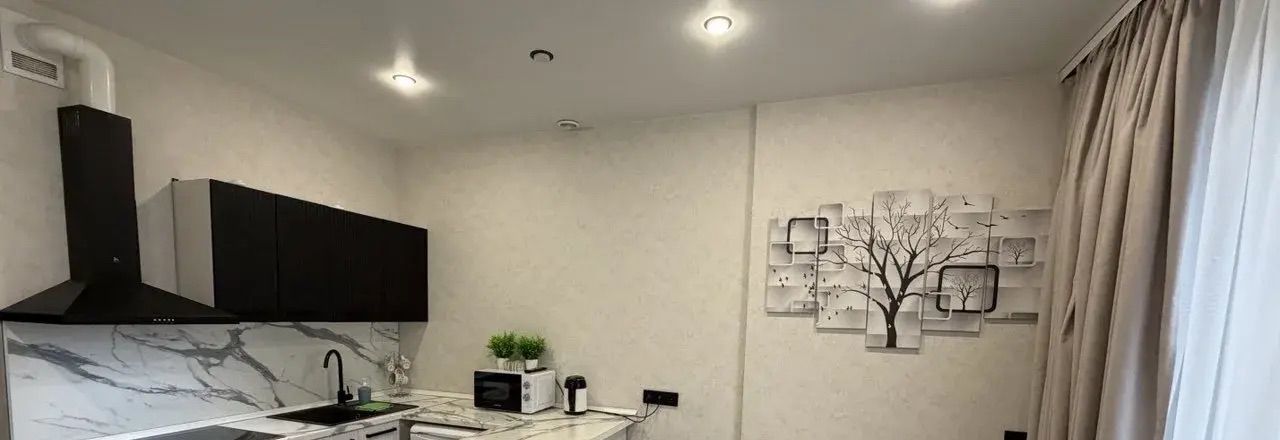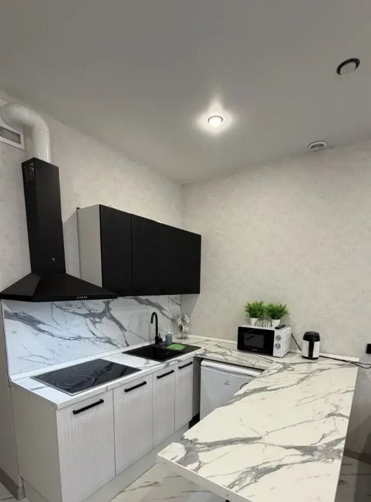 В квартире сделан дизайнерский ремонт. Пространство студии обустроено мебелью как на кухне, так и в комнате, что создает комфортные условия для проживания. В ванной комнате установлена душевая кабина. Вся необходимая техника уже на месте: кондиционер, холодильник, телевизор и стиральная машина. Также в квартире проведен интернет.