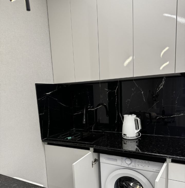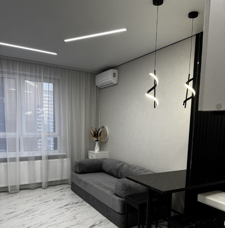 В квартире выполнен качественный евроремонт. Пространство студии продумано до мелочей: в комнате и на кухне есть необходимая мебель, а также вся необходимая техника — кондиционер, холодильник, телевизор и стиральная машина. Окна квартиры выходят во двор, что обеспечивает тишину и спокойствие. Ванная комната оборудована душевой кабиной, что делает утренние сборы быстрыми и комфортными.